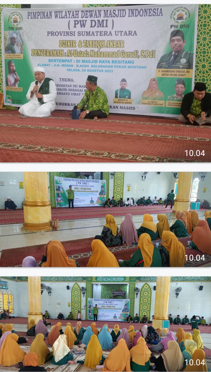 (741 Views) August 30, 2023 4:58 pm | Published by pimred | No comment*Sumut – SuaraJatim.News – Jelang Pemilihan Umum (Pemilu) pada Tahun 2024, Pimpinan Wilayah Dewan Masjid Indonesia (PW DMI) Provinsi Sumatera Utara gelar Dzikir dan Tabliqh Akbar di Masjid Raya Besitang, Jalan Medan – Banda Aceh, Kelurahan Pekan Besitang, Kecamatan Besitang, Kabupaten Langkat, Sumatera Utara (Sumut), Selasa 29 Agustus 2023 sore.