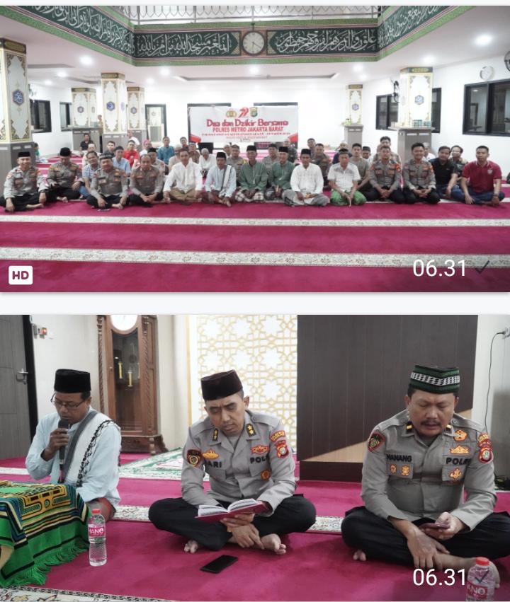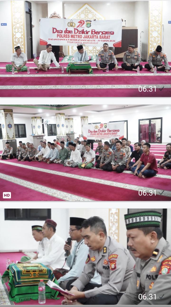 (200 Views) June 28, 2025 3:33 pm | Published by pimred | No commentJakarta Barat – SuaraJatim.News – Dalam suasana penuh kekhusyukan dan kebersamaan, Polres Metro Jakarta Barat menggelar kegiatan doa dan dzikir bersama warga dalam rangka menyambut malam 1 Muharram 1447 Hijriah, yang juga menjadi bagian dari rangkaian peringatan Hari Bhayangkara ke-79. Kegiatan tersebut berlangsung pada Kamis malam, 26 Juni 2025, bertempat di Masjid Jami Al-Istiqomah, Jl. Puskesmas Kedoya Utara Kebon jeruk Jakarta Barat.