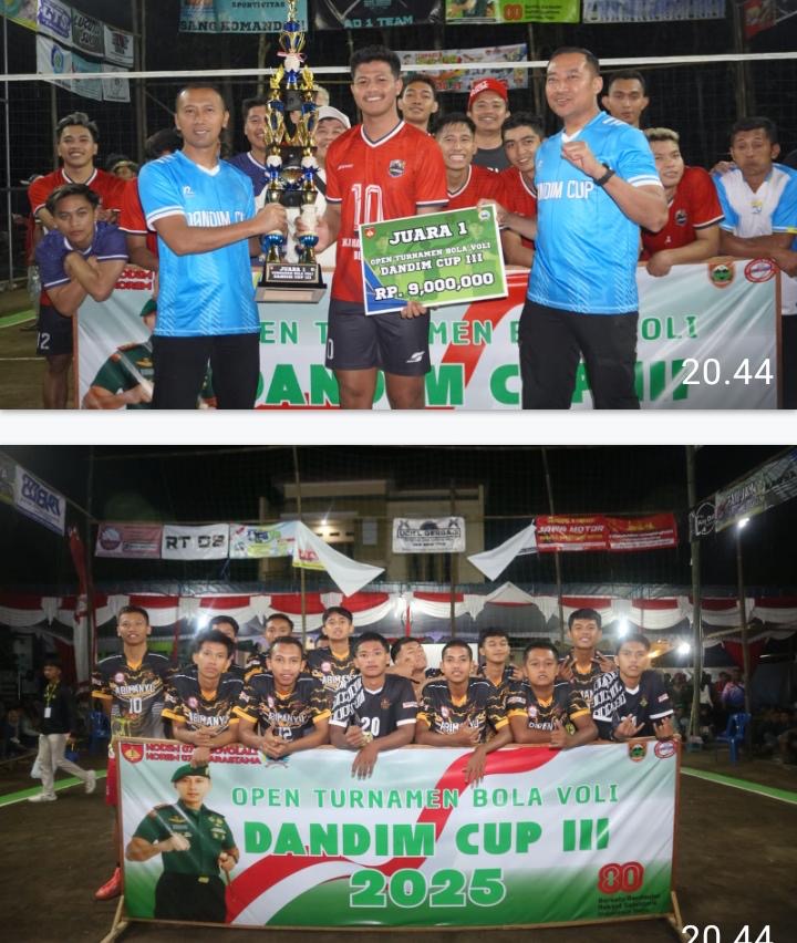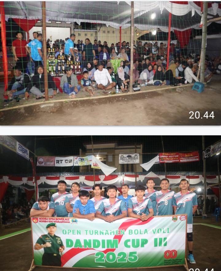 (204 Views) September 9, 2025 2:12 pm | Published by pimred | No commentBoyolali – SuaraJatim.News – Suasana Lapangan Bola Voli Dukuh Mliken, Desa Wates, Kecamatan Simo, benar-benar meledak Ribuan pasang mata tumpah ruah memadati setiap sudut lapangan demi menyaksikan laga puncak Grand Final Turnamen Voli Dandim Cup III 2025 yang mempertemukan tim tangguh Armo melawan Eka Mandiri Jaya, 08 September 2025.