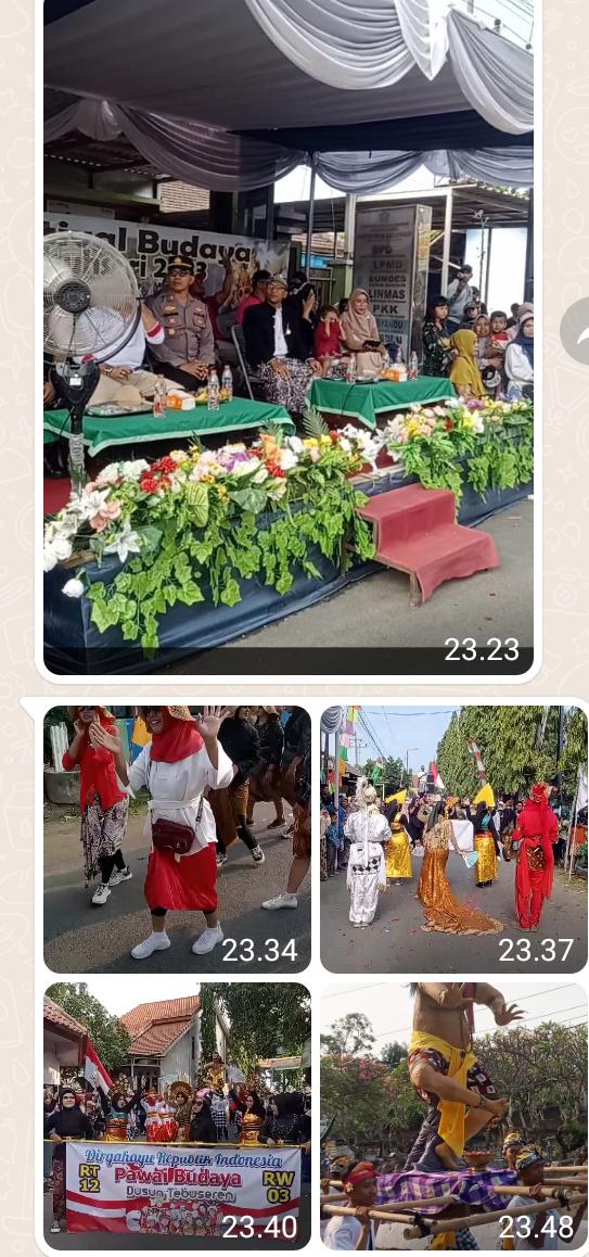 Kreatifitas di tunjukkan oleh masing-masing RT dan beragam kostum dengan perfom joget dan nyel-nyel sound musik dengan lagu yang sesuai tarian serta menampilkan hasil bumi sayuran ikan beserta lainnya.