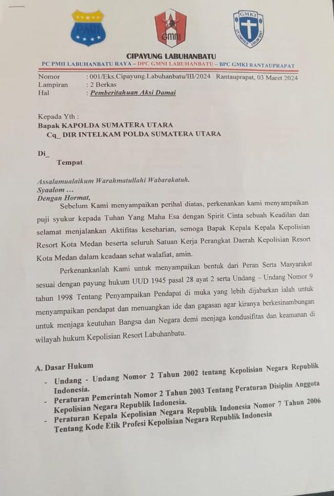 Berdasarkan informasi yang diterima, dengan Nomor Surat 001 / Eks, Cipayung Labuhanbatu/ III / 2024, aksi tersebut akan dilakukan di Mapolda Sumatera Utara, dengan jumlah peserta aksi kurang lebih sebanyak 100 orang Mahasiswa.