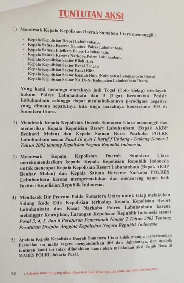 Diketahui juga salah satu poin yang akan menjadi tuntutan peserta aksi Cipayung Labuhanbatu adalah terkait dugaan maraknya judi 303 Toto Gelap (Togel), Narkoba yang berada di Wilayah Hukum Polres Labuhanbatu yang sudah sangat merajalela dan membuat resah masyarakat.