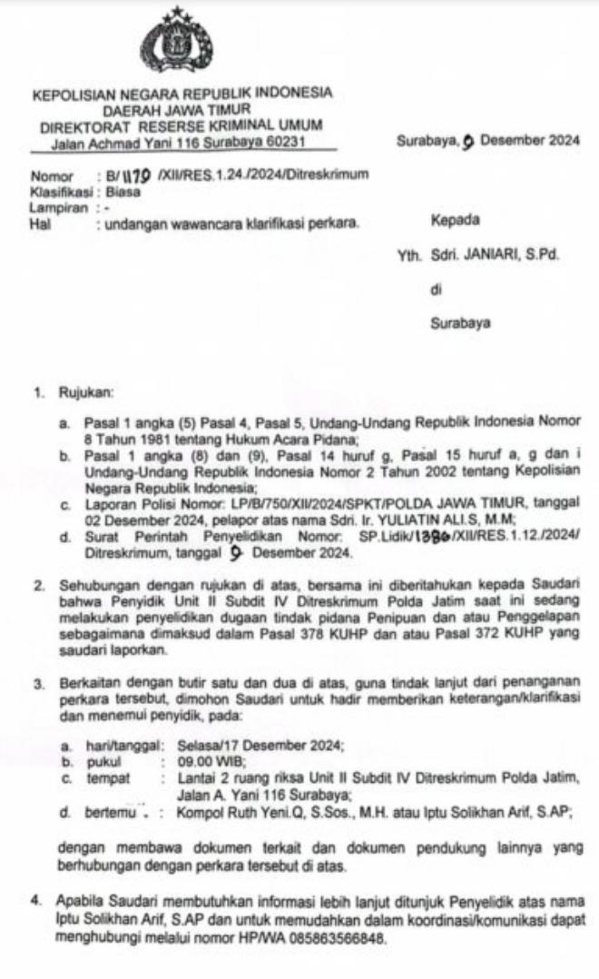 Penasehat hukum Yuliatin, Achmad Khusairi, S.H., M.H., dalam kesempatan wawancara, menyampaikan bahwa dari total 89 Dosen atau PNS Kampus UPN Veteran yang dilaporkan, penyidik Dirkrimum Polda Jatim telah memeriksa 67 Dosen atau PNS kampus UPN Veteran Surabaya. Achmad Khusairi juga menyampaikan bahwa selain 89 dosen atau PNS Kampus UPN Veteran Surabaya yang diduga telah melanggar pengenaan pasal 372 dan atau 378 KUHP Pidana terkait kasus Koperasi UPN Veteran, ditengarai penyidik Dirkrimum Polda Jatim juga akan memanggil Rektor UPN Veteran Surabaya.