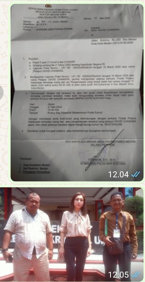 (655 Views) May 28, 2024 7:34 am | Published by pimred | No commentMedan – SuaraJatim.News – Kacau, Penyidik Polsek Medan Area, Polrestabes Medan membatalkan gelar perkara khusus yang rencana akan di gelar di ruang Wasidik Poldasu, Senin 27 Mei 2024.Jam 10.00 Wib. Sesuai dengan undangan yang di terima oleh kuasa hukum korban David Chandra dan korban Lina. Pembatal secara sepihak oleh penyidik Polsek Medan Area diketahui setelah kuasa hukumnya Zoelfikar menerima telpon dari penyidik pembantu Polsek Medan Area Bripka Zefri Suryadi, Senin 27 Mei 2024 sekira pukul 12.08 Wib.
