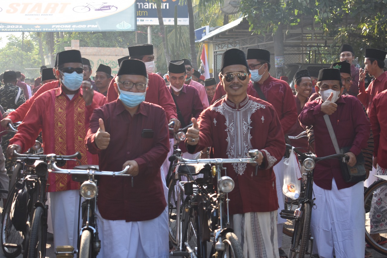 Sabtu pagi (23/10), Kepala Kankemenag Sidoarjo Amir Sholehuddin didampingi Kasi PD Pontren Ahmad Fathoni menghadiri kegiatan Ngonthel Bareng bersama Jama’ah Ngaji Ponpes Mambaul Hikam Putat Tanggulangin. Hadir pula Moh. Sholehuddin, Penyelenggara Zakat Wakaf serta M. Nurul Huda, Unin Bisono, dan Suparman, staf PD Pontren Kankemenag Sidoarjo. Kegiatan ini merupakan acara rutin tahunan yang digelar oleh pondok pesantren tersebut dalam setiap momen peringatan Hari Santri Nasional. Uniknya, seluruh peserta memakai baju merah dan bersarung putih sebagai wujud Nasionalisme para santri. Menurut Amir, kegiatan Ngonthel bareng ini sesuai dengan tema HSN 2021 yang diharapkan santri sehat jasmani dan berperan aktif dalam membangun negeri kita tercinta.