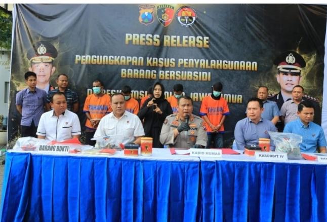 (296 Views) March 5, 2025 3:44 pm | Published by pimred | No commentSurabaya – SuaraJatim.News – Direktorat Reserse Kriminal Khusus (Ditreskrimsus) Polda Jawa Timur berhasil mengungkap praktik pengoplosan LPG bersubsidi ukuran 3 kilogram ke tabung non subsidi berkapasitas 12 kilogram dan 50 kilogram di Kabupaten Jombang Kabidhumas Polda Jatim, Kombes Pol Dirmanto mengatakan dari hasil pengungkapan tersebut, Polisi mengamankan empat orang yang diduga kuat sebagai pelaku. “Dari pengungkapan kasus ini ada 4 orang yang diamanakan yaitu berinisial MS, MM, AK, dan SZ,” ujar Kombes Dirmanto di Mapolda Jatim, Selasa 4 Maret 2025.
