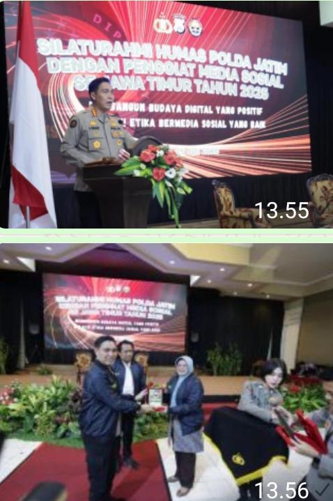 (330 Views) July 26, 2025 3:17 pm | Published by pimred | No commentJawa Timur – SuaraJatim.News – Dalam rangka mempererat tali Silaturahmi Polda Jawa Timur dengan para perwakilan pegiat Media Sosial, Bidang Humas Polda Jatim melalui Subbid Multimedia menggelar penguatan jaringan netizen Jatim. Kopi darat (Kopdar) bersama perwakilan pegiat media sosial (Netizen) se Jawa Timur yang mengusung tema ‘ Membangun Budaya Digital Yang Positif Melalui Etika Bermedia Sosial Yang Baik’ itu dilaksanakan di Kota Batu, Jawa Timur.