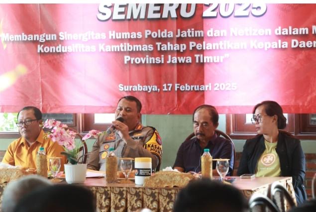 (423 Views) February 18, 2025 10:32 pm | Published by pimred | No commentSurabaya – SuaraJatim.News – Bidang Hubungan Masyarakat (Bidhumas) Polda Jatim menyelenggarakan acara silaturahmi dengan netizen Surabaya Raya dalam rangka Operasi Mantap Praja Semeru 2025.