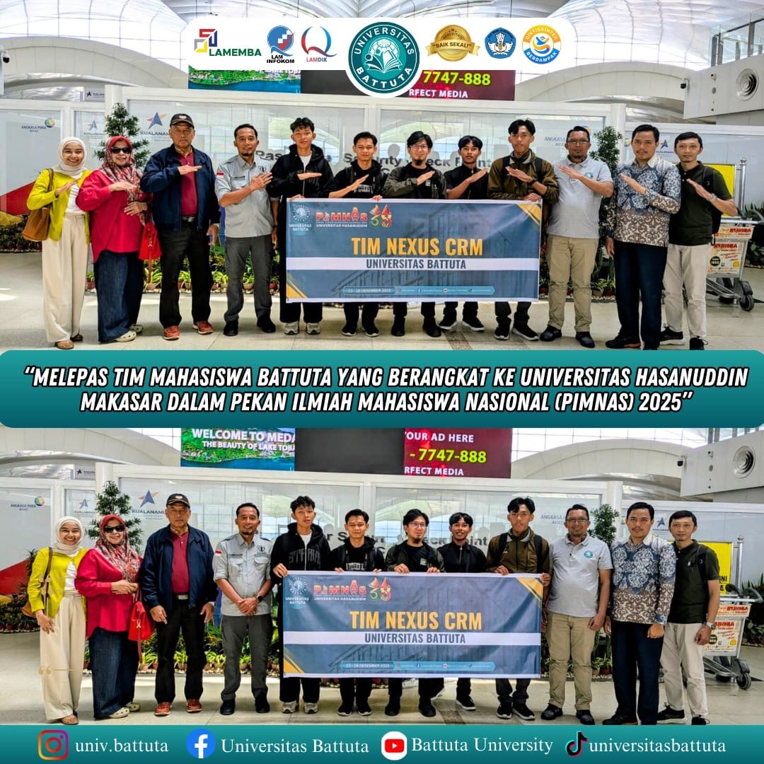 (255 Views) November 26, 2025 2:54 am | Published by pimred | No commentSumatra Utara – SuaraJatim.News – Ketua Pengurus Yayasan dan Rektorat Universitas Battuta melepas Tim Mahasiswa dan Dosen Pembimbing Universitas Battuta (@pkmpi.nexuscrm ) untuk berangkat ke Pekan Ilmiah Mahasiswa Nasional (PIMNAS) Tahun 2025 di Universitas Hasanuddin Makassar dan menjadi 1 dari 4 Perguruan Tinggi yang mewakili Sumatera Utara.